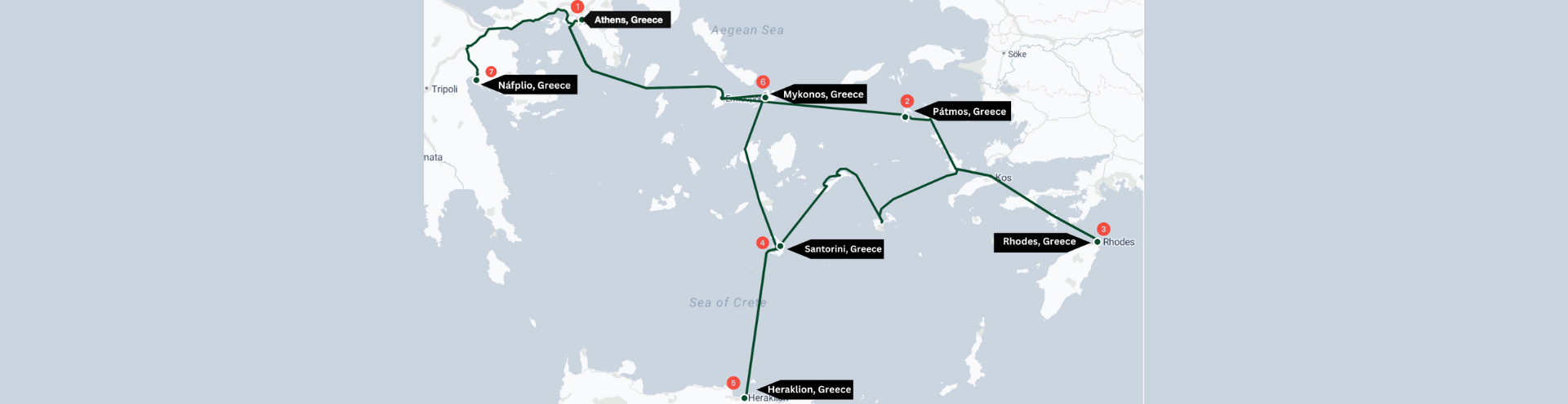 - 7 night Greek Isles cruise round trip Athens visiting Patmos, Rhodes, Santorini, Amorgos, Delos, Mykonos, & Nafplion
