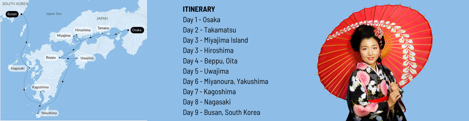 - 8 night voyage starting in Osaka visiting Takamatsu, Miyajima Island, Hiroshima, Beppu, Uwajima, Miyanoura, Kagnoshima & Busan